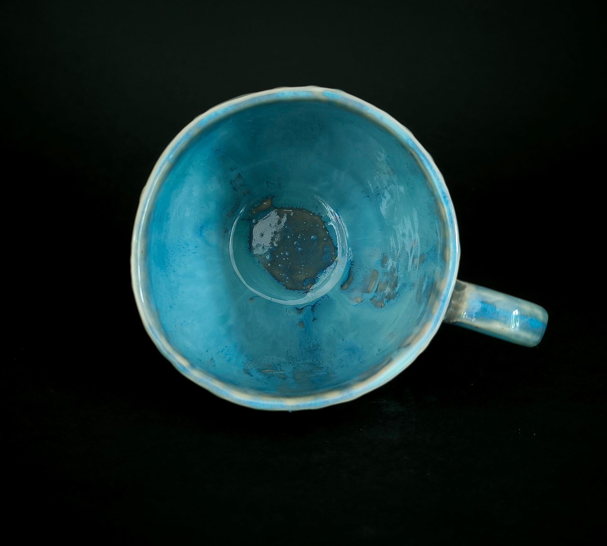 This handmade ceramic mug features a unique textured marine pattern in various shades of blue and white. With a capacity of 400ml and dishwasher-safe, it is perfect for everyday use. Please note that the colors may vary slightly from the picture due to glaze effects. Suitable for food use.