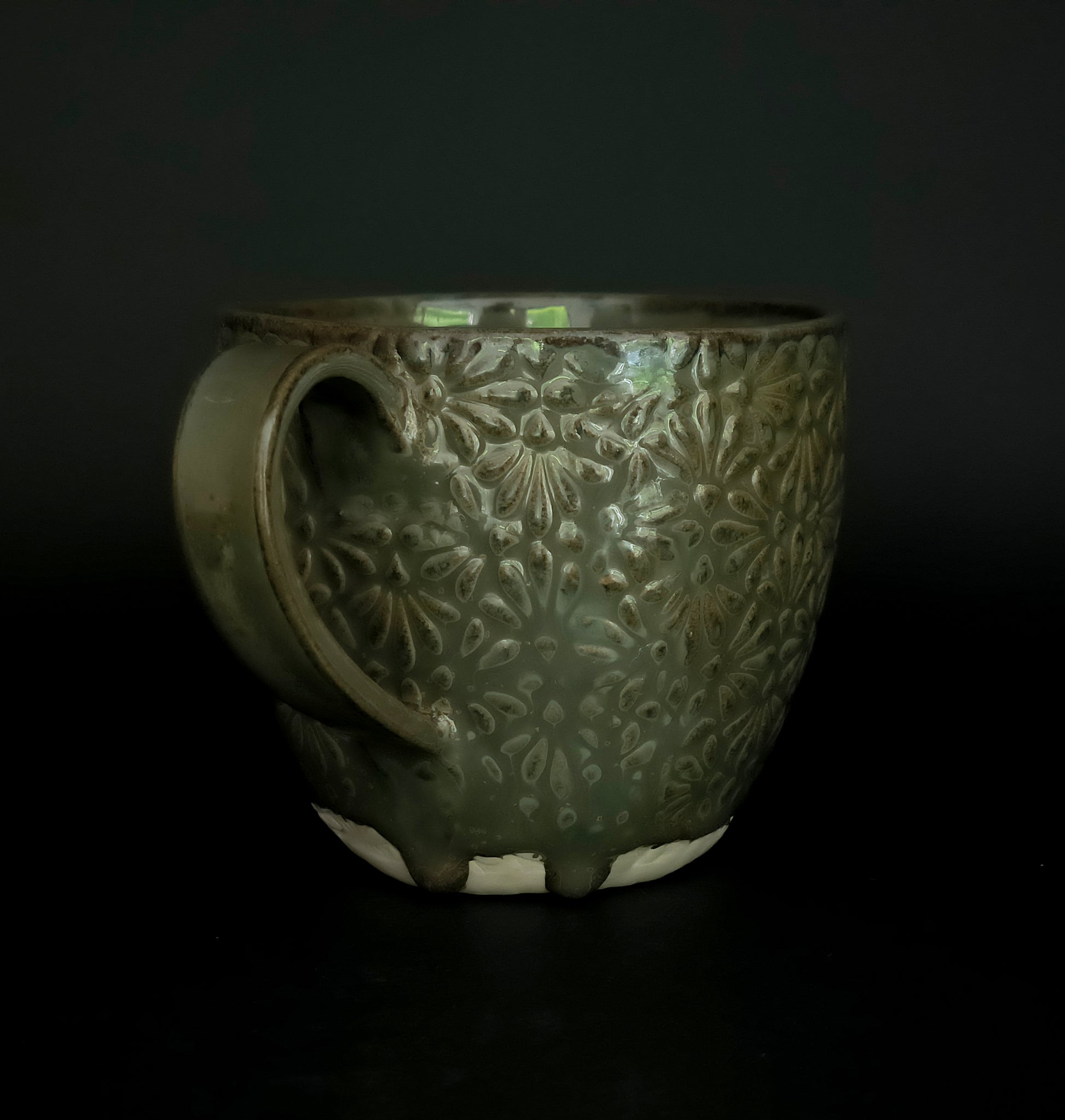 Handcrafted with care and attention to detail, featuring a delicate embossed botanical pattern in soft, muted greyish-green tones with gentle brown transitions. It brings a calm, natural charm to your everyday coffee or tea ritual.